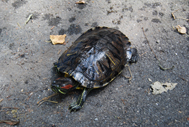 井の頭池をはじめ、私たちの身近な水辺では、ミシシッピアカミミガメ(ミドリガメ)、オオクチバス(ブラックバス)、ブルーギルなど、もともとすんでいなかった生き物ばかりが目に付くようになりました。いろいろな人が、さまざまなかたちで、たくさんの生き物を放流しています。しかし、放流された生き物がどのような問題を引き起こしているのかは、あまり知られていません。