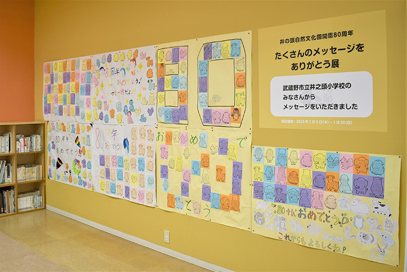 井の頭自然文化園は開園80周年を迎えて、さまざまなイベントを開催してきました。そのなかで、多くのみなさまから心のこもったメッセージをいただきましたので、スタッフ一同からの感謝の気持ちを込めて、そのメッセージの数々を紹介しています。色とりどりのメッセージカードで飾られた展示をぜひご覧ください。
