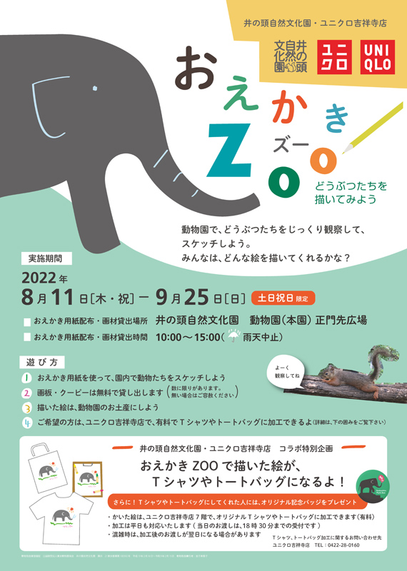 井の頭自然文化園では、ユニクロ吉祥寺店との共同企画として、おえかき用紙と画材を無料で貸し出し、どうぶつたちをスケッチしてもらう「おえかきZOO」を開催します。