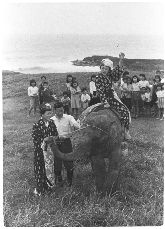 下の写真は、伊豆大島の島娘・あんこ姿の女の人が、ちいさなゾウ(はな子)の背中に乗っているようすです。