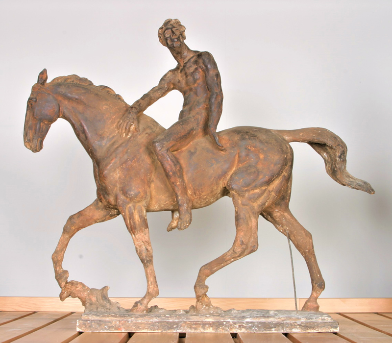 長崎の《平和祈念像》で知られる北村西望ですが、戦前は軍人騎馬像の銅像を依頼により制作していました。戦後になってから、騎馬像は社会的な権力のある人物ではなく、裸体の解放された人間や女神をのせて、自由や平和の意味を投影しました。また晩年にかけては、戦国武将などの歴史上の人物の騎馬像を、歴史絵巻の図像から着想しました。