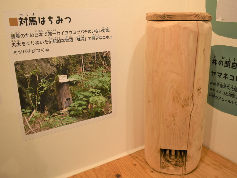 対馬の伝統的なニホンミツバチの巣箱「蜂洞」。 当園での展示のために対馬市から贈られました | 展示場で飼育係員がトレーニング中!? |