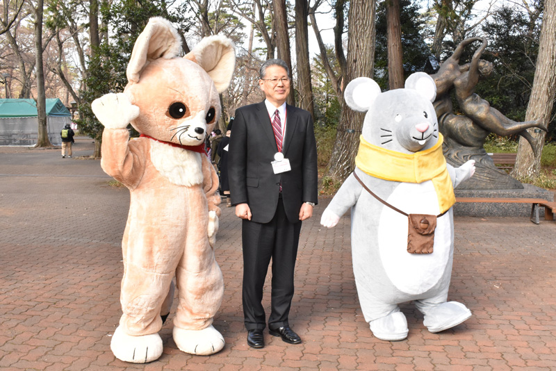 新春にご来園いただいたみなさまを、園長と着ぐるみの動物がお出迎えします。