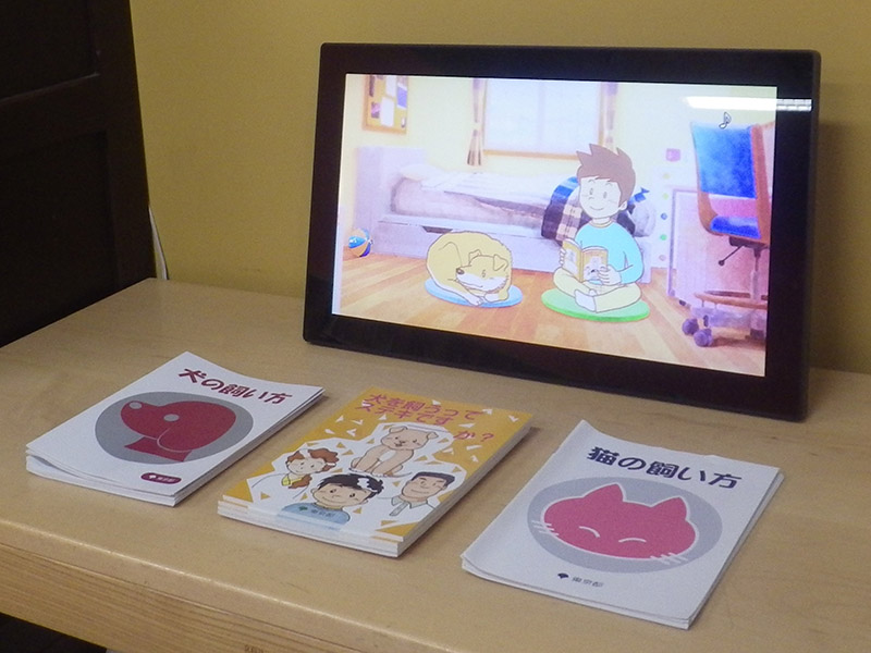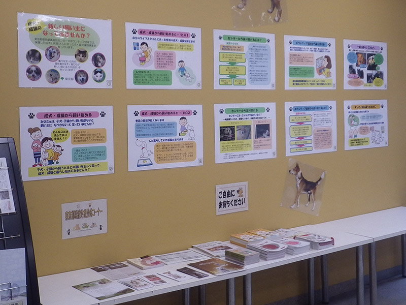 犬や猫の飼い方、飼い主としての心構えなどに関するパンフレット、保護した犬や猫の譲渡についてのパンフレットなどを配布します。