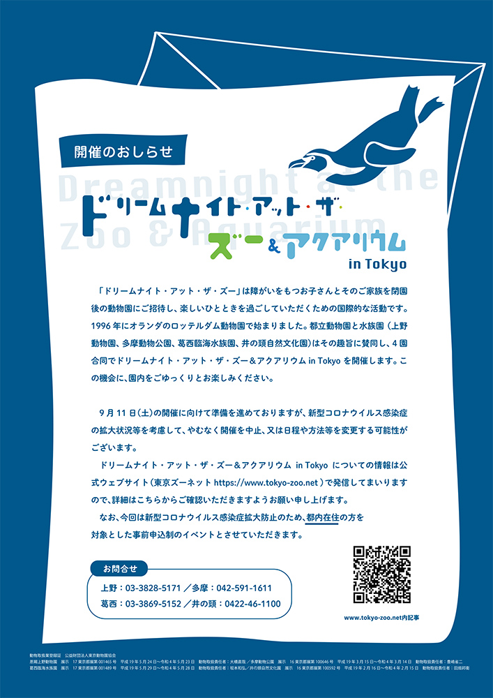 2021年9月11日(土)に開催予定だった「ドリームナイト・アット・ザ・ズー」は、新型コロナウイルス感染症の拡大状況を踏まえ、開催を中止することとしました。
