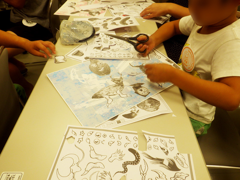 その後、動物や動物園で使用されている道具などのさまざまな写真やイラストを素材として、自由な発想で動物園オリジナル妖怪づくりに挑戦します。