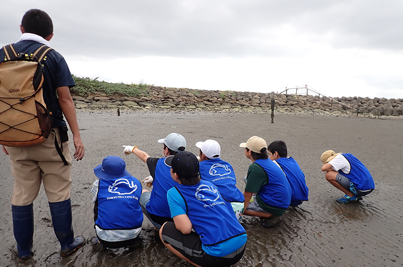 「集まれ!汐っ子たち」は小学5、6年生を対象としたプログラムです。葛西海浜公園にある人工干潟「西なぎさ」。一見、一面泥だけの単調な環境にみえる干潟にも、泥っぽいところ、砂っぽいところ、しおだまりなど多様な環境があり、くらしている生きものが異なります。干潟で生きものを探し、捕まえ、それらをじっくりと観察する体験を通して、生きものの体のつくりと環境とそのくらしの関わりを学びます。