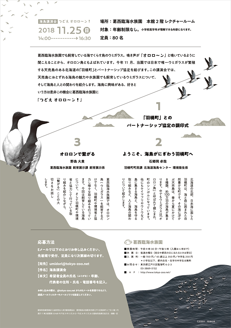 葛西臨海水族園では、海鳥をテーマにした講演会を開催します。当園ではウミガラス、エトピリカという海鳥を飼育しており、繁殖にも成功しています。現在は各30羽程飼育していますが、国内では絶滅危惧種に指定されている鳥でもあります。