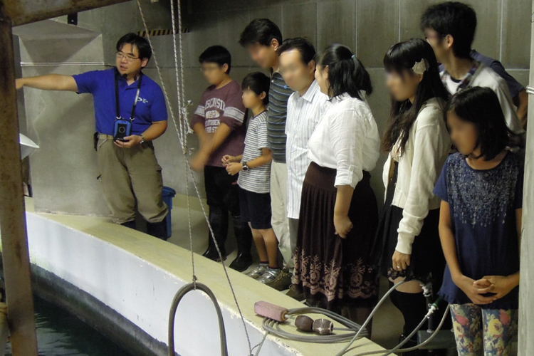 スタッフがマグロの飼育現場をご案内します。水槽の上からマグロはどのように見えるでしょう?