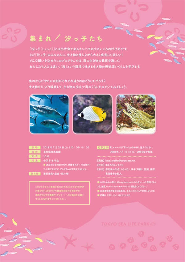 葛西臨海水族園では、小学5、6年生を対象にしたプログラム「集まれ!汐っ子(しょっこ)たち2018」を実施します。