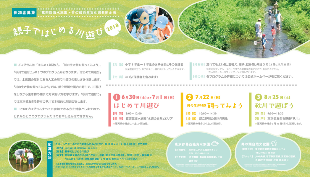 kawaasobi@tokyo-zoo.net宛に、件名を「親子ではじめる川遊び」とし、本文に参加希望者全員の氏名(ふりがな)・年齢・性別、住所・電話番号、