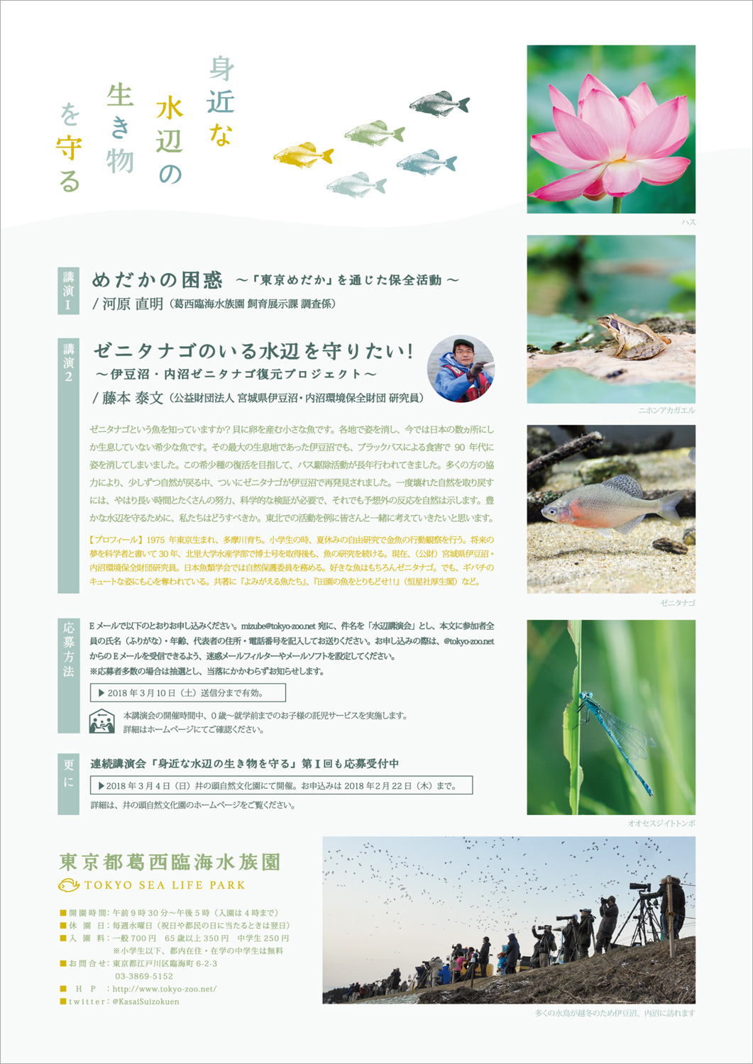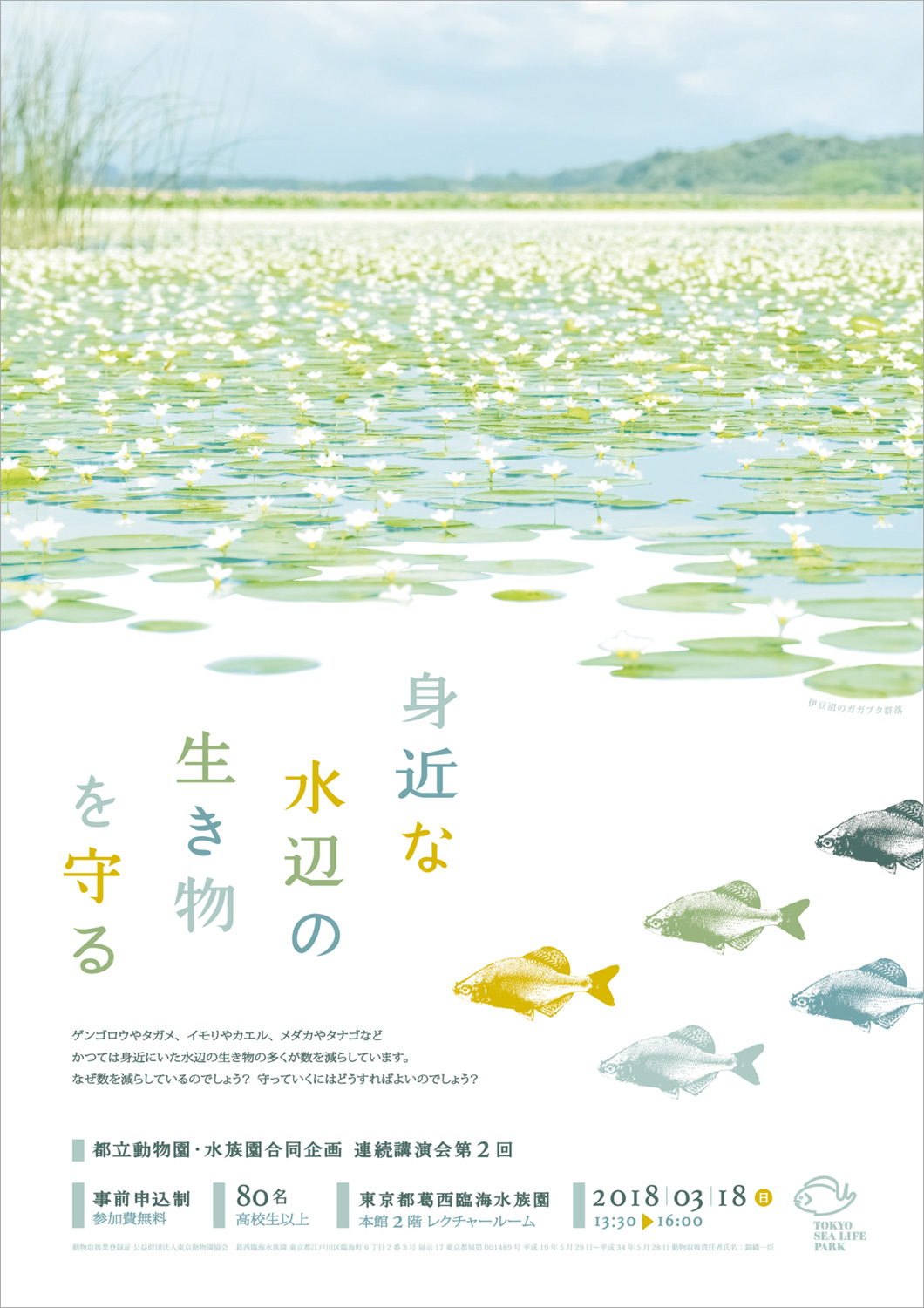 連続講演会「身近な水辺の生き物を守る」の第1回は、2018年3月4日(日)に井の頭自然文化園にて開催いたします。お申込みは2月22日(木)までです(