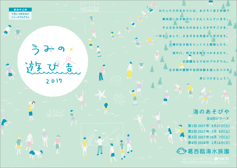 「海のあそびや2017」を開催しています。海には驚くほど多様で、興味深い生き物がくらしています。「海のあそびや」では、生き物たちのおもしろさやすごさを、一年を通して、さまざまな角度から学びます。水槽の生き物をじっくりと観察したり、海や川で生き物を捕まえたり、水族園ならではのプログラムで生き物の観察や自然体験を楽しむコツを身につけましょう!