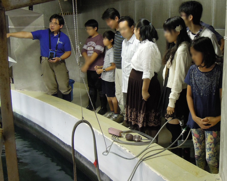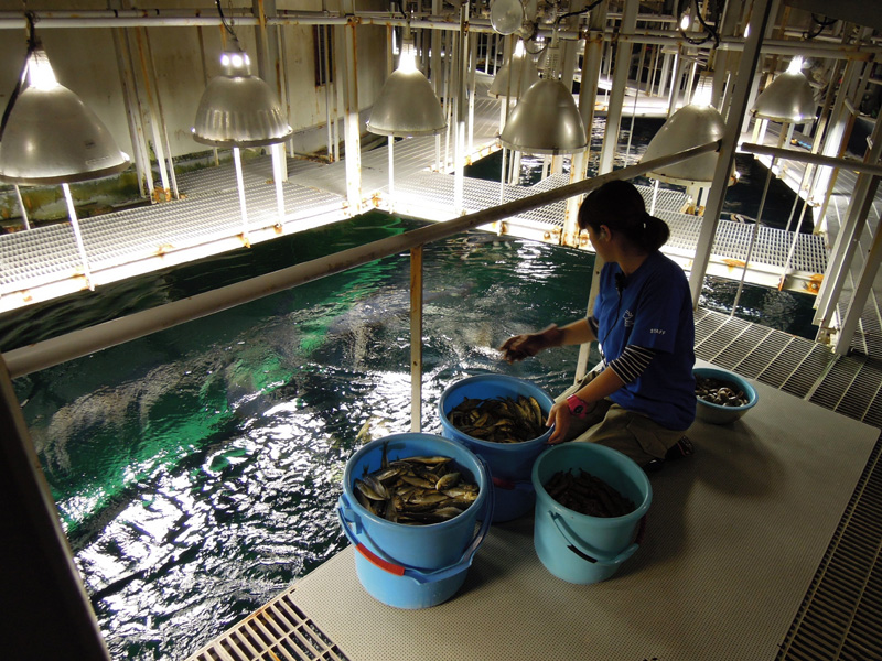 スタッフがマグロの飼育現場をご案内します。水槽の上からマグロはどのように見えるでしょう?
