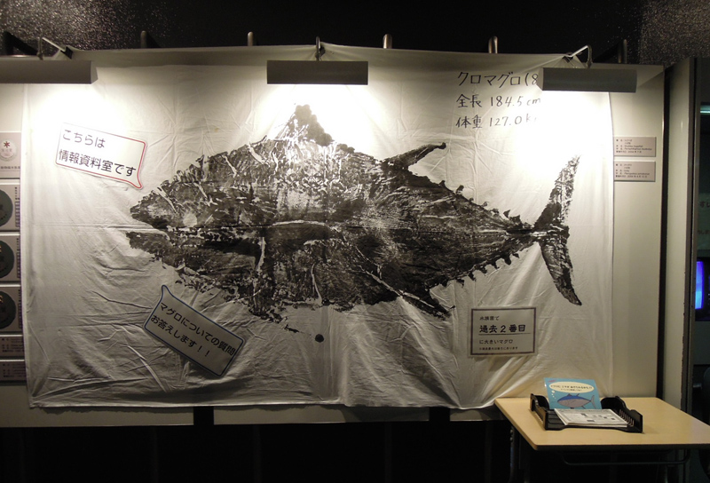 水槽内で育った2m級のクロマグロの魚拓、水槽内で産んだクロマグロの卵や孵化仔魚の標本、産卵の瞬間のビデオ映像、マグロの輸送道具など、さまざまなマグログッズを用意してお待ちしています。スタッフがマグロに関する質問にもお答えします。