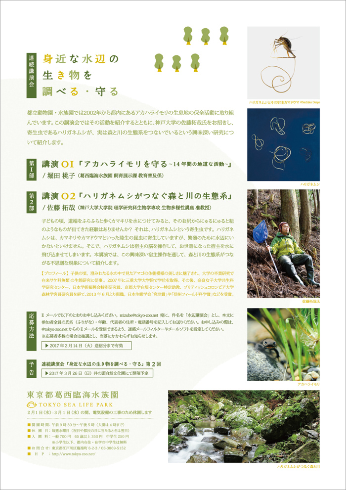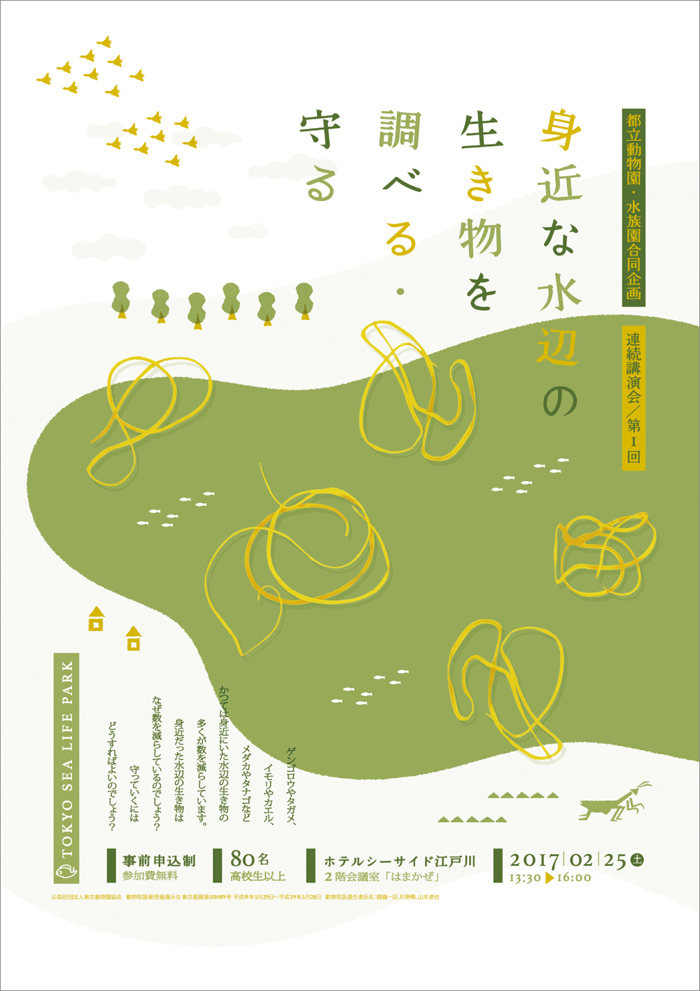 連続講演会「身近な水辺の生き物を調べる・守る」の第2回は、井の頭自然文化園で3月26日(日)に開催予定です。