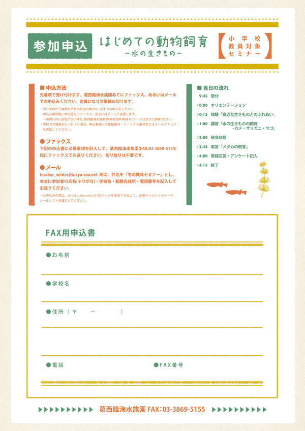 こちらのFAX申込書(PDF・A4・1ページ)をダウンロードして印刷し、必要事項を記入して、葛西臨海水族園(FAX:03-3869-5155)宛にファックスでお送りください。