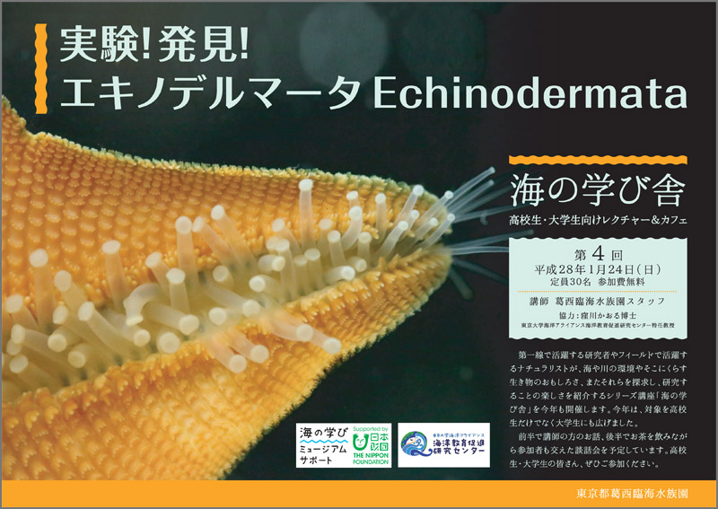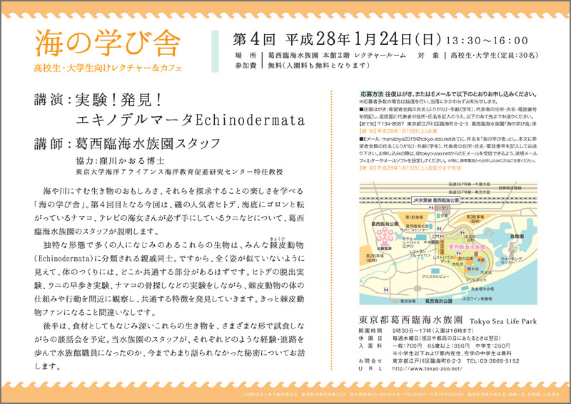 第4回目となる今回は、葛西臨海水族園のスタッフがヒトデやウニなどの棘皮(きょくひ)動物を取り上げます。前半ではさまざまな実験を交えながらのレクチャー、後半ではお茶を飲みながら参加者も交えた談話会を予定しています。高校生・大学生のみなさん、ぜひご参加ください。