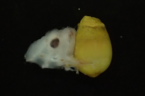 そのまま経過を観察していたところ、およそ半年後の2015年10月19日~20日の未明にかけて、幼生が孵化したと考えられます。20日の朝に職員が確認した際には、孵化の途中段階であった幼生はすでに死亡していました。