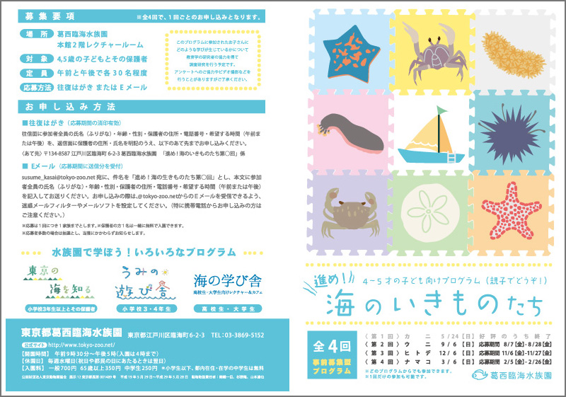 susume_kasai@tokyo-zoo.net 宛に、件名を「進め!海のいきものたち 第3回」とし、本文に参加者全員の氏名(ふりがな)・年齢、性別、保護者の住所・電話番号、希望する時間(午前または午後)を記入してお送り下さい。お申し込みの際は、@tokyo-zoo.netからのEメールを受信できるよう、迷惑メールフィルターやメールソフトを設定してください。(特に携帯電話からお申し込みの方はご注意ください。)