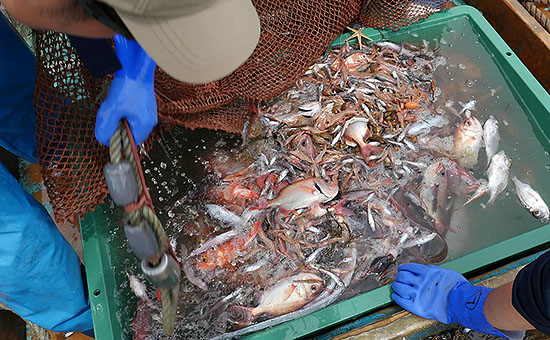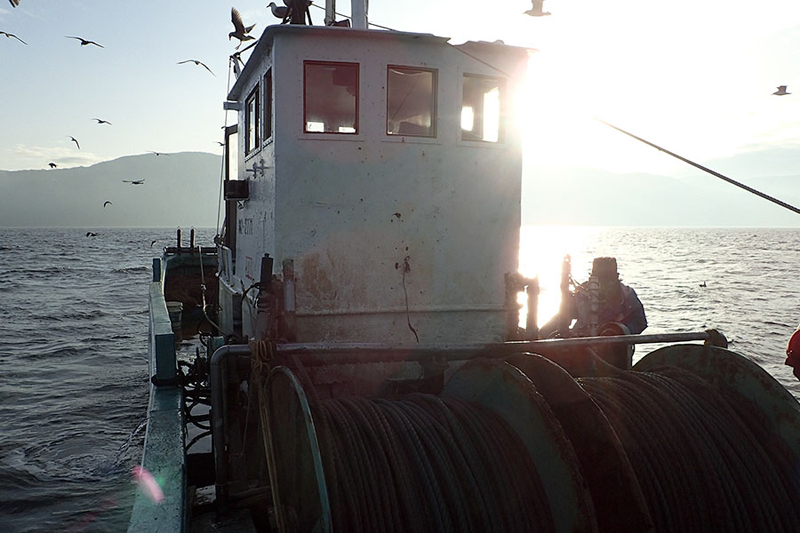 左:メンダコ 右:採集のために乗り込んだ漁船
