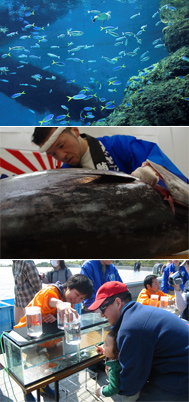 プロのマグロの解体師により、クロマグロを丸ごと1尾解体し、私たちが食べるマグロの刺身ができるまでを実演してもらいながら、マグロのおいしさのヒミツ、トロや赤身など各部位の名称や特徴などを紹介してもらいます。また、同時に水族園スタッフが、マグロの体に隠された、高速で泳ぎ続けるためのさまざまな工夫を解説します。