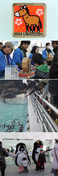 葛西臨海水族園のアイドル、フンボルトペンギンの「ペンちゃん」とイワトビペンギンの「ガンちゃん」が、みなさまに新年のご挨拶。ペンちゃん&ガンちゃん(着ぐるみ)と一緒に記念写真をどうぞ。カメラは各自ご持参ください。