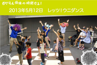 2013年5月12日(日)におこなわれた、今年度はじめての「かさりん体操」のようすをお伝えします。踊った曲は「レッツ!ウニダンス」です。集まってくれたお友だちは、元気いっぱいに踊ってくれました。みんな、ウニのトゲのポーズが決まっていました。