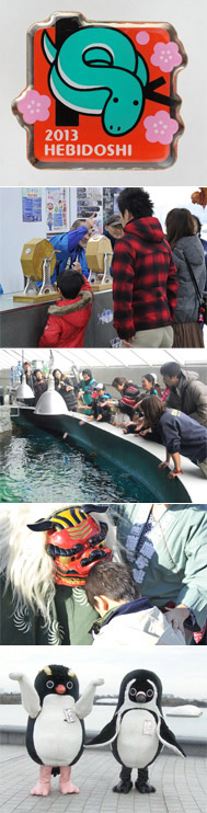 当園のアイドル、フンボルトペンギンの「ペンちゃん」とイワトビペンギンの「ガンちゃん」(着ぐるみ)が、みなさんに新年のご挨拶。ペンちゃん&ガンちゃんと一緒に記念写真をどうぞ。