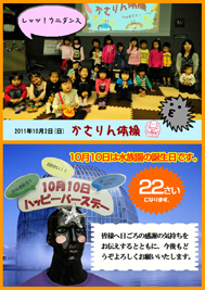 さて、2011年10月2日(日)の「かさりん体操」は「レッツ!ウニダンス」でした。「まんまるトゲトゲ」のフレーズに合わせて、大人の方にも多数ご参加いただきました。ありがとうございました。