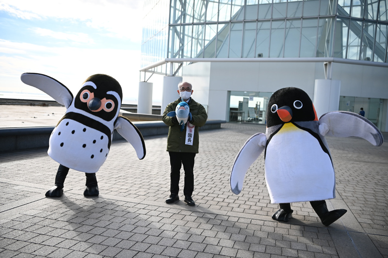 オウサマペンギンの「オーちゃん」とフンボルトペンギンの「フーちゃん」が、みなさまに新年のごあいさつ! 1月2日は園長もみなさまをお出迎えします。