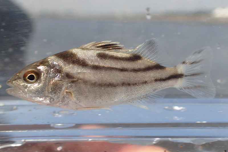 | 小型地引き網調査のようす | 地引き網で採れたコトヒキ |