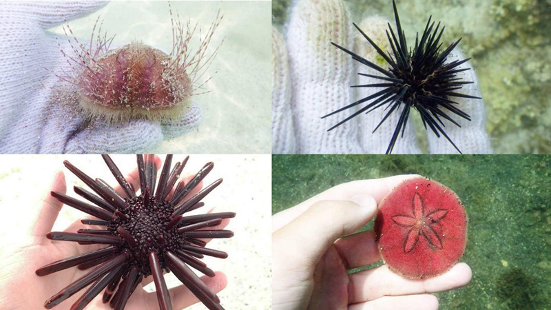 (左上:ヒラタブンブク、右上:クロウニ、左下:パイプウニ、右下:ヨツアナカシパン)