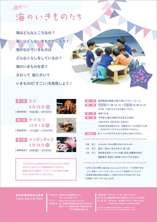 susume_kasai@tokyo-zoo.net宛に、件名を「進め!海のいきものたち第4回」とし、本文に参加希望者の氏名(ふりがな)・年齢・性別、保護者の氏名・住所・電話番号、