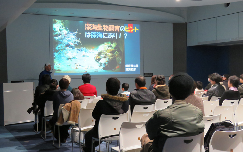 水族園スタッフによるトークショーです。テーマは「採って運んで飼育して──深海展示のつくりかた」。水族園で展示している深海の生き物をどのように採集し、運んでくるのか、そして深海はどんなところなのかをお話します。