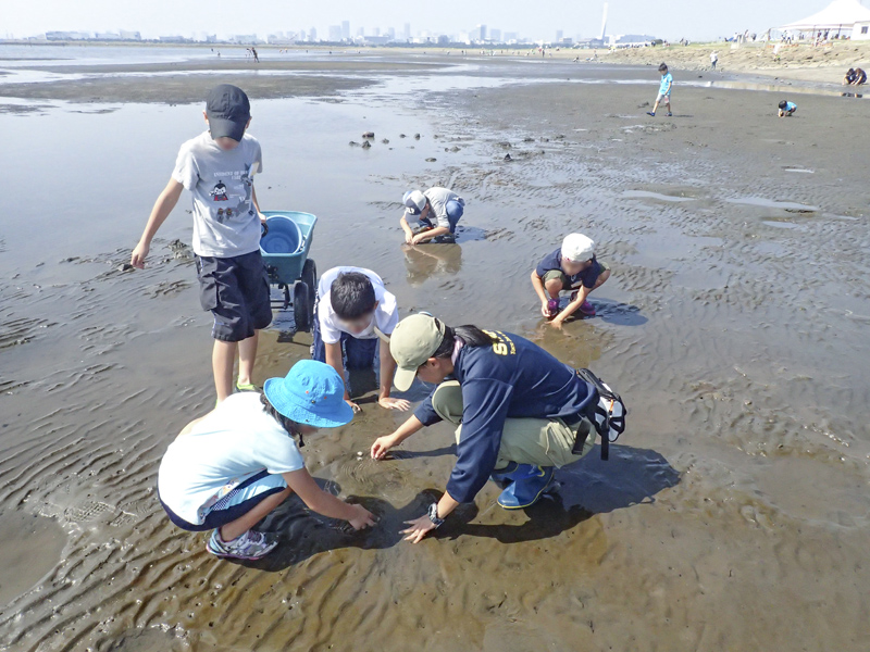 人工の干潟「西なぎさ」でさまざまな生き物の「すみか」を探します。一面泥だけの単調な環境にみえる干潟にも、泥っぽいところ、砂っぽいところ、しおだまりなど多様な環境があり、くらしている生き物が異なります。