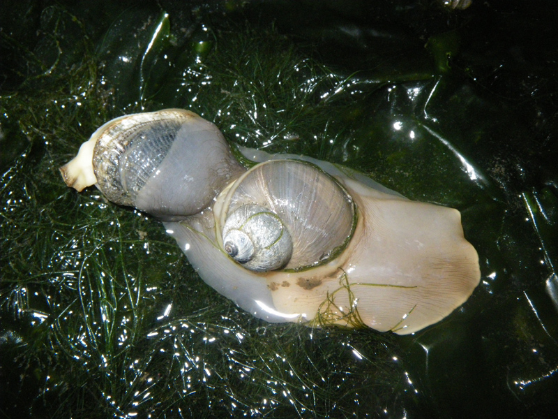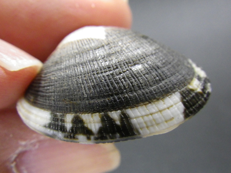 | 津波によるストレスで途中から模様が変わったアサリ | 外来巻貝のサキグロタマツメタ |
