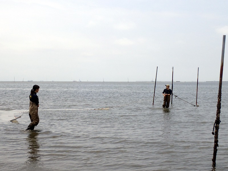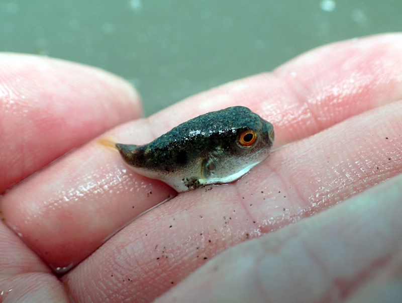 | 地曳網作業中 | 地曳網で採れたもの | 地曳網で採れたトラフグの稚魚 |