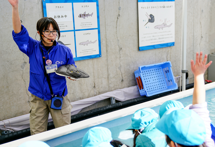 解説を聞きながら、サメやエイをじっくり観察し、直接さわってその体のつくりを感じる教育プログラムです。