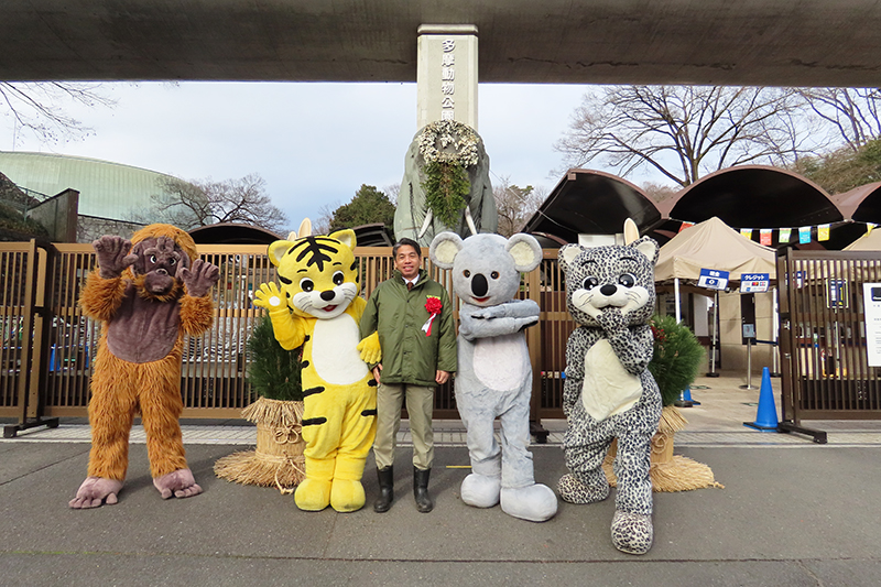 園長が新年のごあいさつをするとともに、ご来園いただいたみなさまを着ぐるみがお出迎えします。