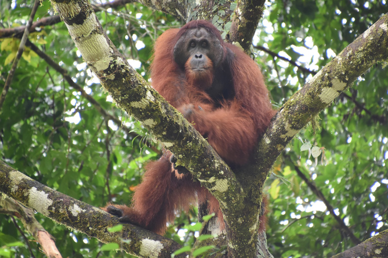 オランウータンは地球上で最も大きい樹上性動物です。オトナのオスは80kg、メスは40kgになりますが、食事もトイレも交尾も、生活のすべてが木の上で行われます。しかし、大きな体で樹上を移動するのは、実はとても危険なことなのです。