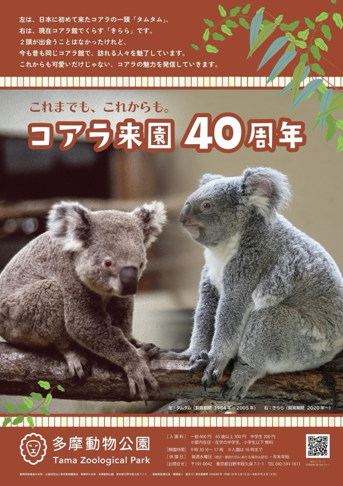 多摩動物公園は、日本で初めてオーストラリアからコアラを受け入れた動物園の一つです。1984年(昭和59年)10月25日に飼育を開始して以来、コアラの飼育を続け、繁殖や研究に取組んできました。今年で40年を迎えることを記念しイベントを開催します。ぜひご来園ください。