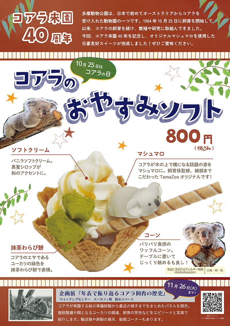 コアラ来園40周年を記念し、コアラのマシュマロを使用した日豪友好スイーツを販売します。マシュマロはコアラ担当の飼育係が細部までこだわって監修した当園オリジナルです。