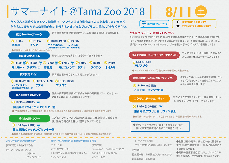 ※上記以外の動物は概ね20時まで展示しますが、動物の健康管理の都合上、早めに寝小屋に入る場合があります。詳しくは当日園内で配布するチラシや掲示物をご覧ください。