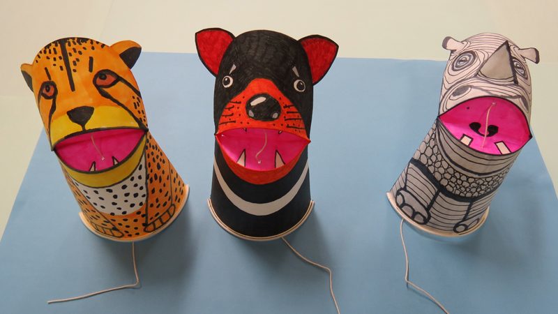切れ目の入った紙コップに、底面が口になるように、動物の顔や模様を描きます。仕上げにタコ糸をとおし、口がパクパクする人形をつくります。