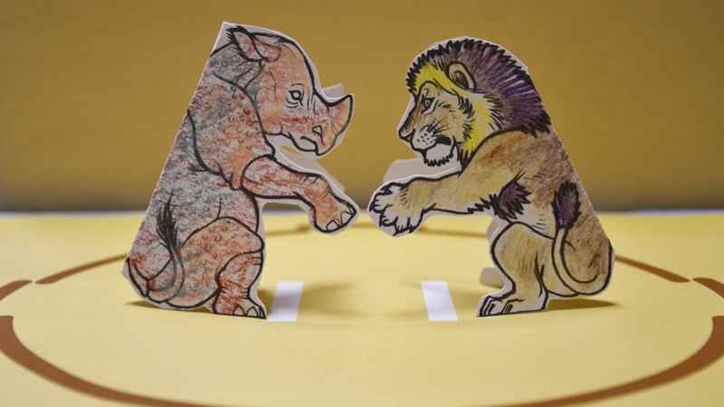 厚紙でできた動物力士に色を塗ります。完成した力士を使って土俵で対戦して遊びます。保護者の方も一緒に遊べます。