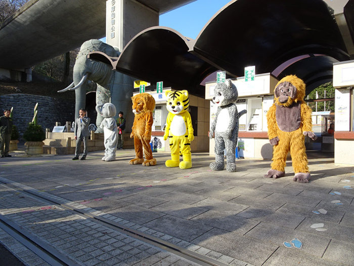 園長が新年のごあいさつをするとともに、着ぐるみの動物たちがご来園の皆様をお出迎えします!