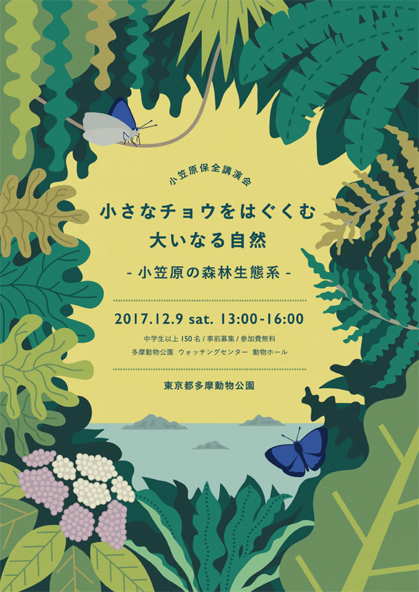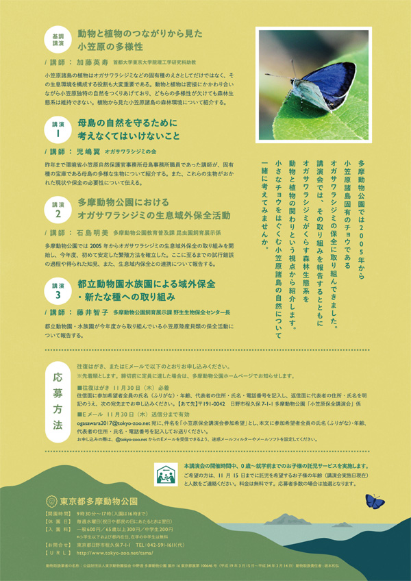 2017年の講演会では、大きく数を減らし、現在は小笠原諸島の母島だけに生息する絶滅危惧種・オガサワラシジミをテーマに、小さなチョウを育んでいる森林生態系について動物と植物の関係という視点で紹介するとともに、当園での保全活動について報告します。