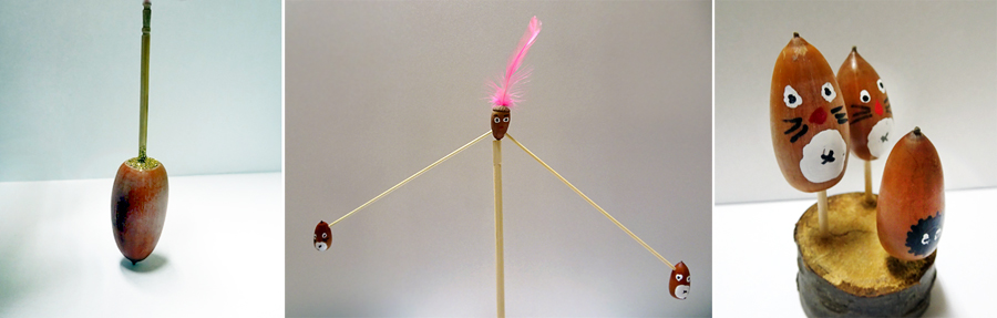 どんぐりを使って「コマ」や「やじろべえ」「人形」をつくります。作り方はとっても簡単です。ちいさなお子さんでもお楽しめる工作です。
