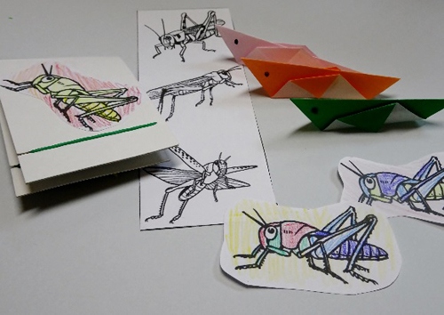 折り紙のバッタで遊んだり、バッタの絵に色をぬった後、厚紙とゴムを使って、バッタの様に飛ぶおもちゃを作ります。小さなお子様に、おすすめの内容です。